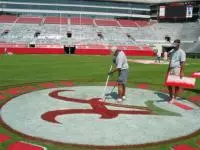 Bryant-Denny’s playing surface is made up of a Bermuda 419 grass that is currently over-seeded with rye grass for when the weather gets cooler this fall. On game week, the field crew begins painting the lines on the field first thing Thursday morning. Once the lines are painted, the endzones and field logos are stenciled out and painted. On Friday they come back and touch up the details of the logos and paint the second color of trim on the numbers and end zones. This gives the paint time to dry overnight and the crews do not have to work around wet paint. The crew uses a special paint that will not harm the soil or the grass, made especially for athletic fields.